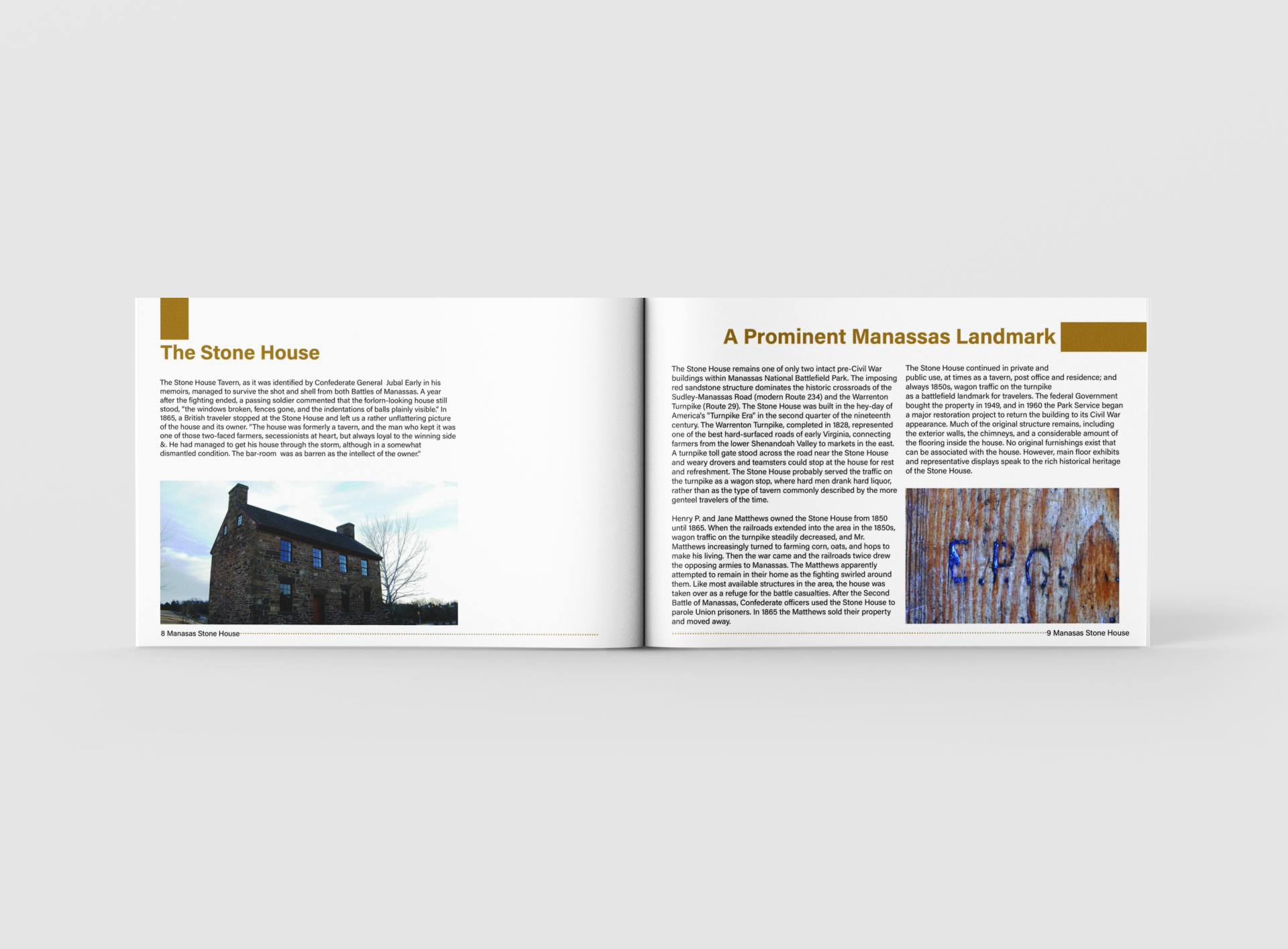 I designed a booklet about Manassas Stone House in Manassas National Battlefield Park to give visitors an idea of the site's history. Using Indesign, I carefully chose the colors, images, and typefaces.