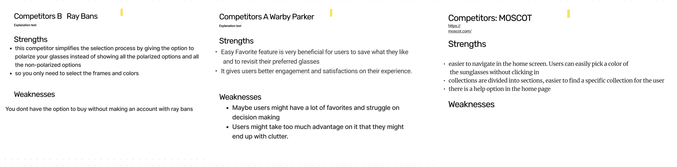 We listed out all our competitors strength and weakness so we can use that information to find ways to stand out. We focused on things they do well that we don't for inspiration, and finding new ideas that they haven't.